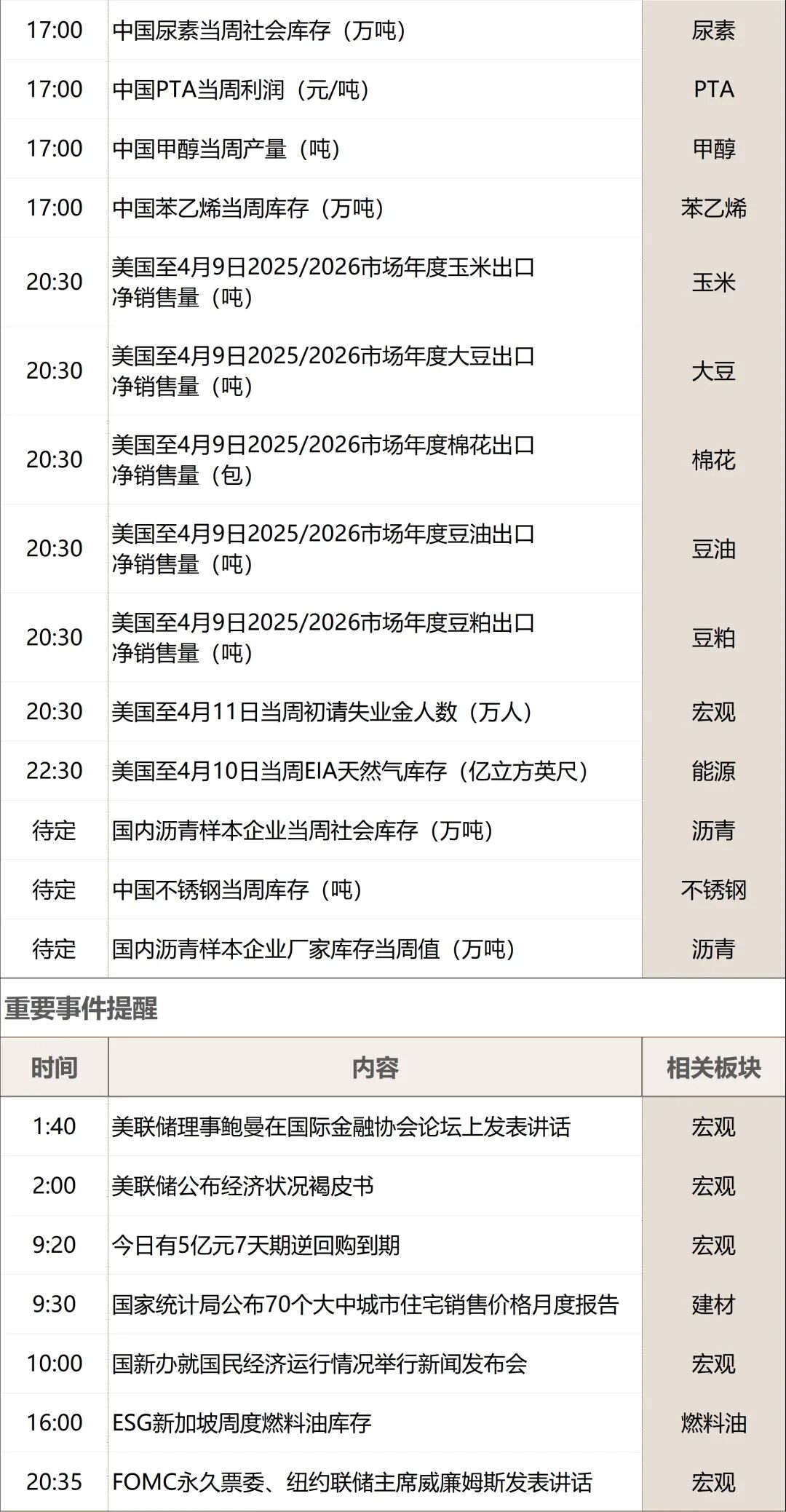 周度重要数据发布时间提醒(4月13日-4月18日)